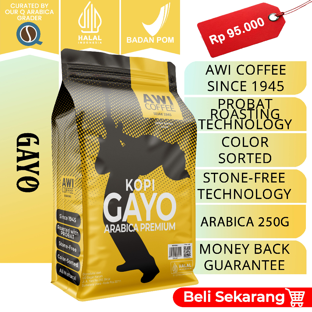 Awi Kopi Gayo Arabica Premium 250Gr Biji | Roasted Coffee Beans | Aceh Grade 1 Kualitas Ekspor