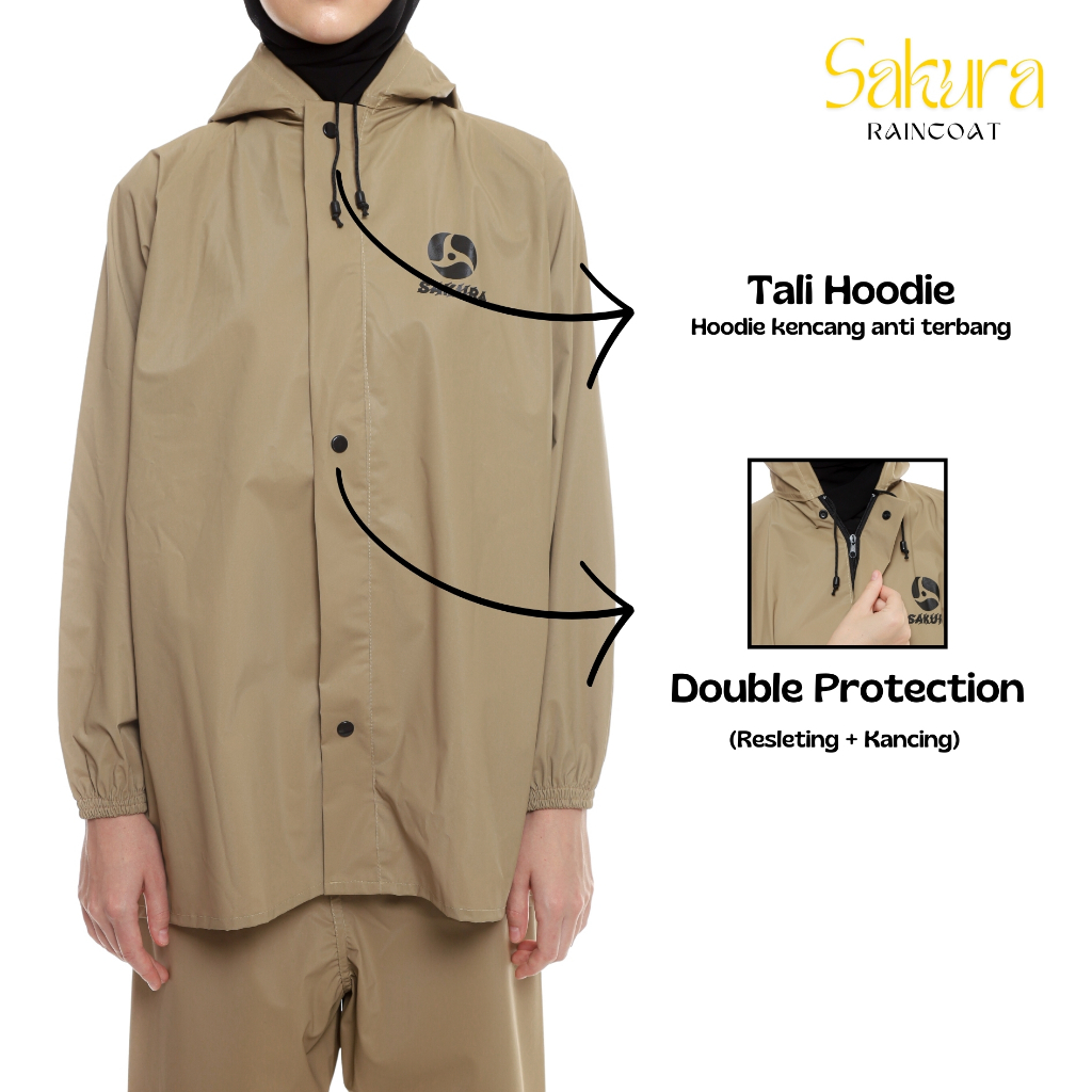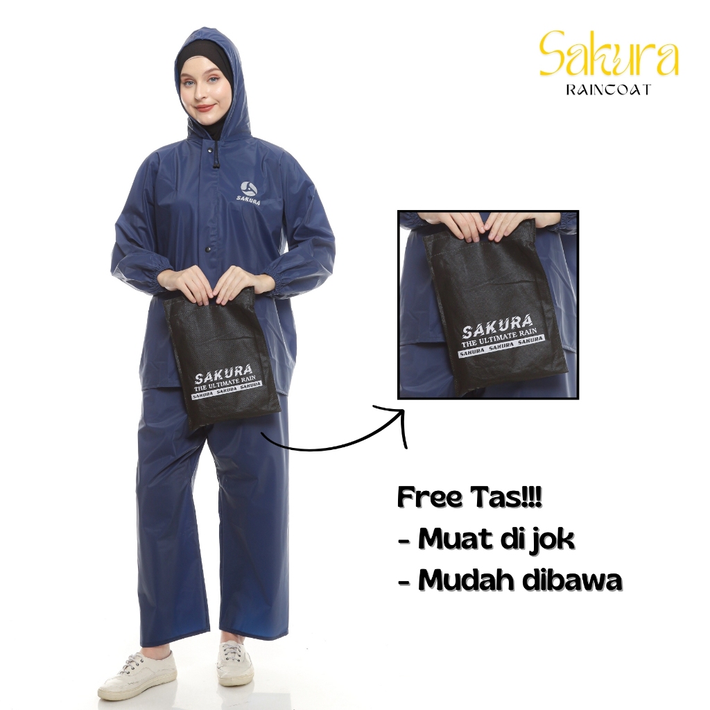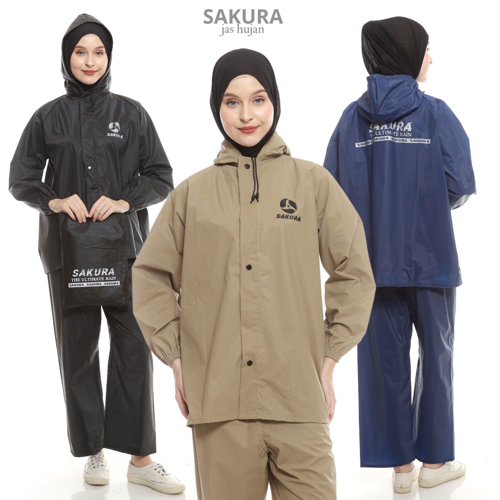 Jas Hujan Pria Wanita Setelan Jaket Celana Dewasa PVC 0.25 Tebal Elastis Anti Air Sakura