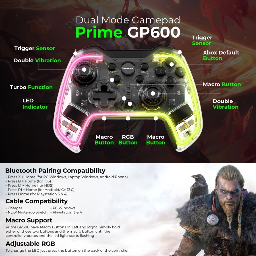 Gamepad nyk nemesis single bluetooth wired turbo macro rgb for pc laptop android ios N-switch p3 p4 prime gp-600 gp600