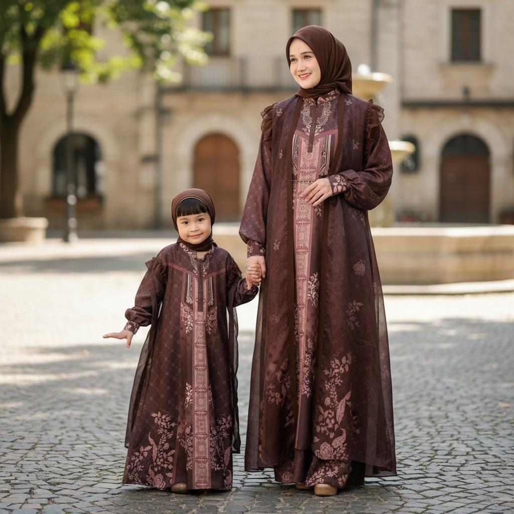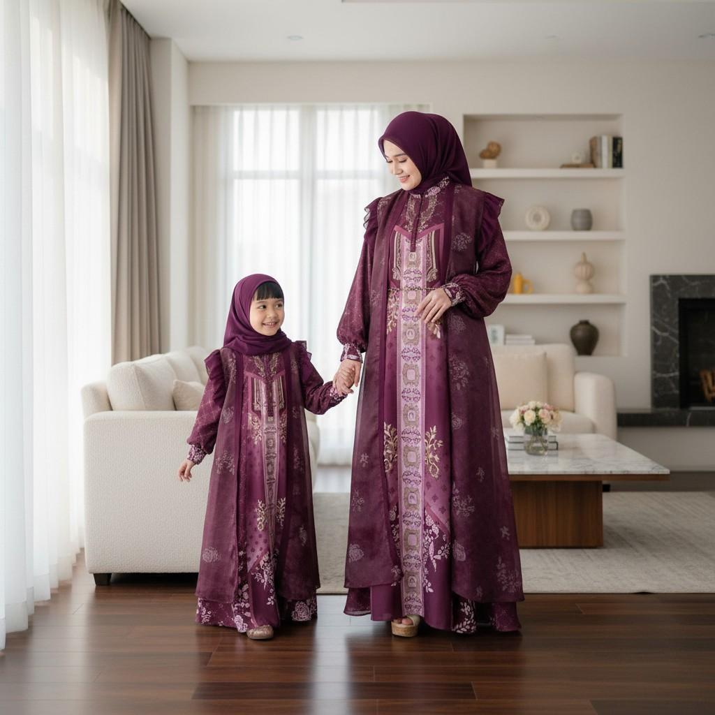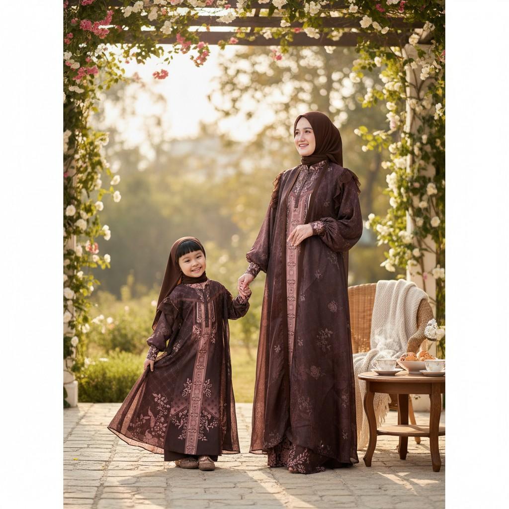 Noby Collection - Maraya One Set 3in1 Gamis Bahan Marbella Silk Outer Organza Print Set Hijab Anak Perempuan Couple Moms Harga Satuan Edisi Hari Raya 2026