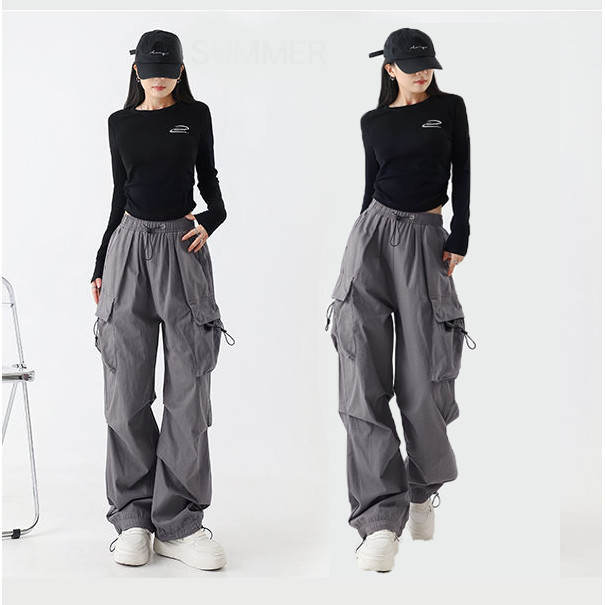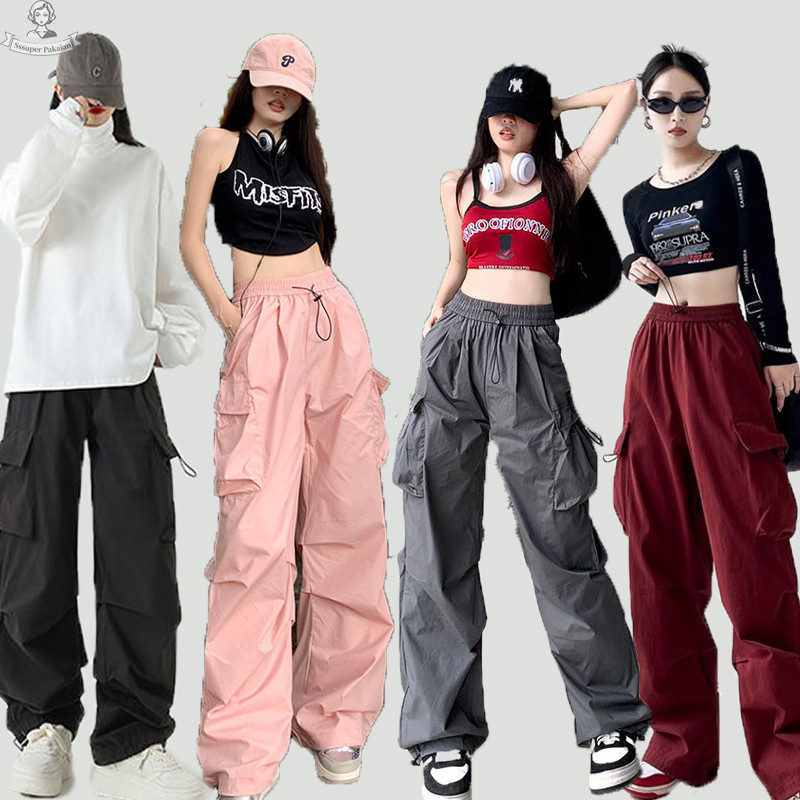 S5XL Celana Cargo Retro Wanita Celana Kasual Longgar Pinggang Tinggi Gaya Korea Celana Olahraga Banyak Saku