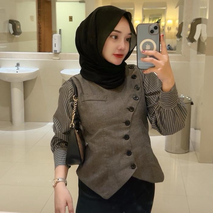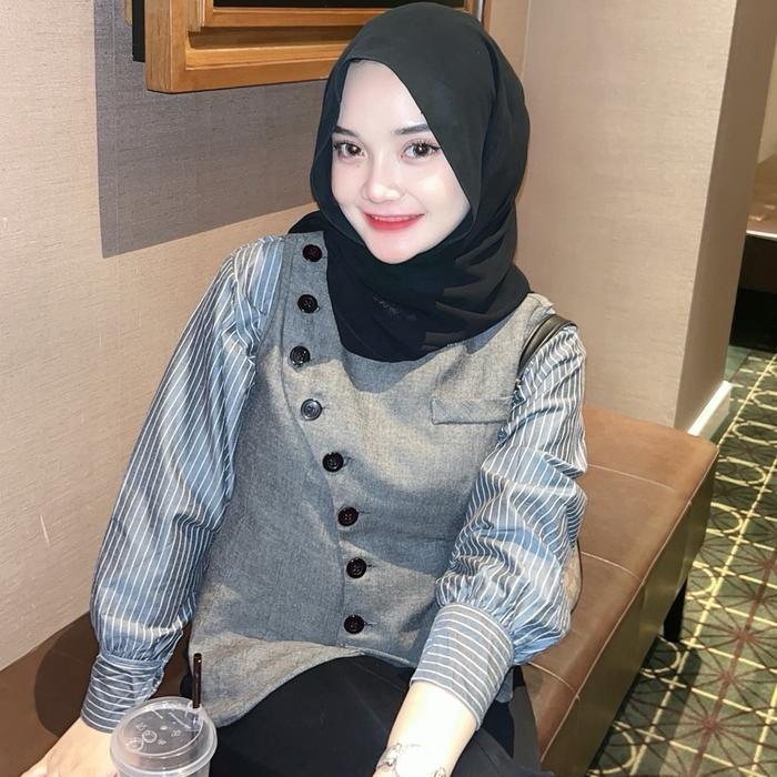 KEMEJA SALUR STRIP BONUS FREE VEST KOREAN STYLE - KEMEJA ABU + VEST ABU-ABU