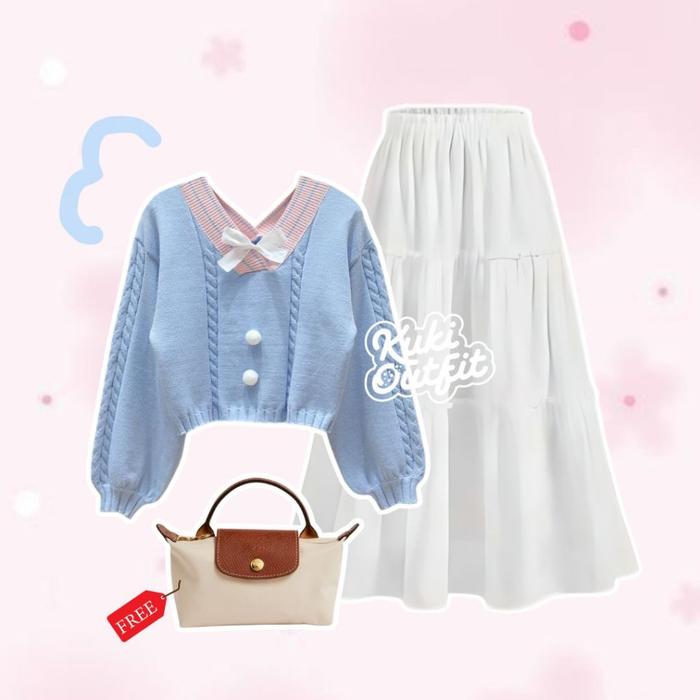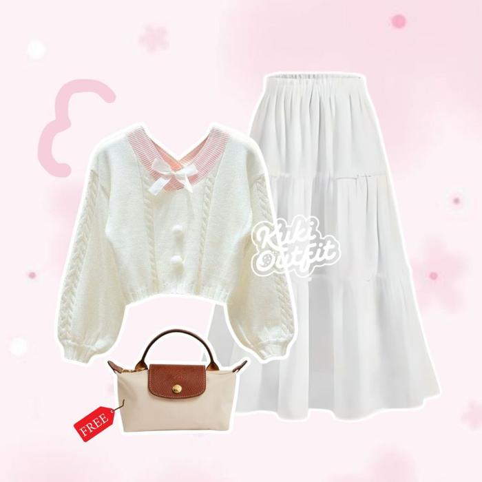 KUKI OUTFIT - ONESET (SWEATER RAJUT + ROK) FREE TAS ROK DAN ATASAN WANITA KOREAN STYLE - KK217 PANJANG PINK BAWAHAN CARD