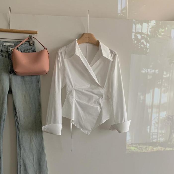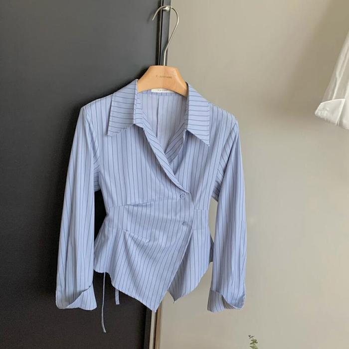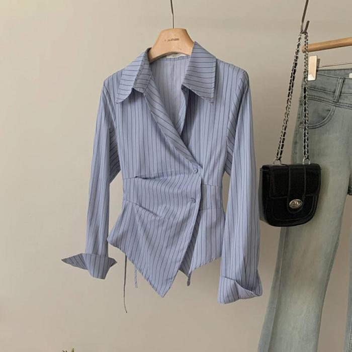 KEMEJA RETNO SLIM FIT V-NECK ATASAN RAMPING LENGAN PANJANG BERKERUT KOREA STYLE #W402 WOMEN FASHION RETRO STRIPED PRINT