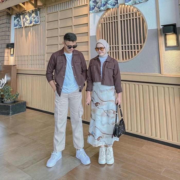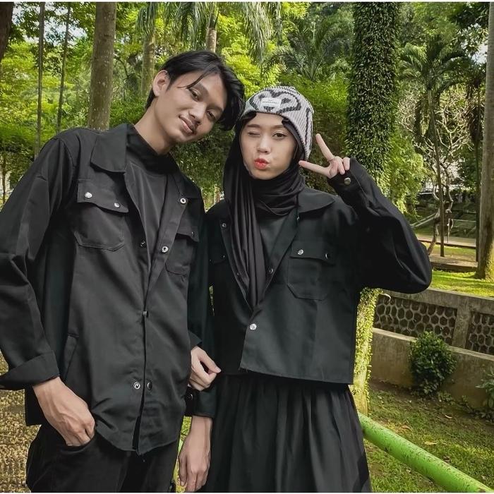 COUPLE SET KAMEJA CANVAS COUPLE SUDAH 2PCS BAJU COUPLE WANITA KOREAN STYLE - CREM, M BIASA M CROP