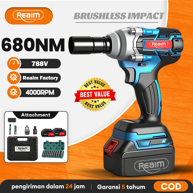 Reaim Cordless Impact Wrench Brushless 788V 680N/M, Mesin Bor Mobil, Baterai Impek, 2 Baterai, Torsi Besar, Alat Buka Ba
