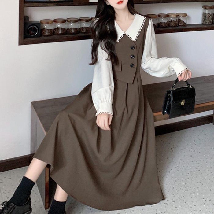 FIRST GIRL-MIDI DRESS WANITA VINTAGE STYLE KOREA DRESS COLLAR BEST SELLER - G019 CASUAL SIMPLE - ROK PENDEK, XL