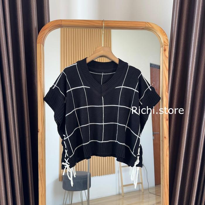 JENNA VEST CROP RAJUT ATASAN WANITA PENDEK KNITWEAR ROMPI KOTAK TALI SERUT - KHAKI