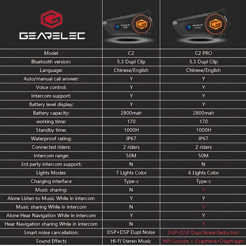 GEARELEC C2 Pro Motorcycle Helmet Intercom Headset 2 Riders 50m Intercom Support Music Sharing While In Intercom
