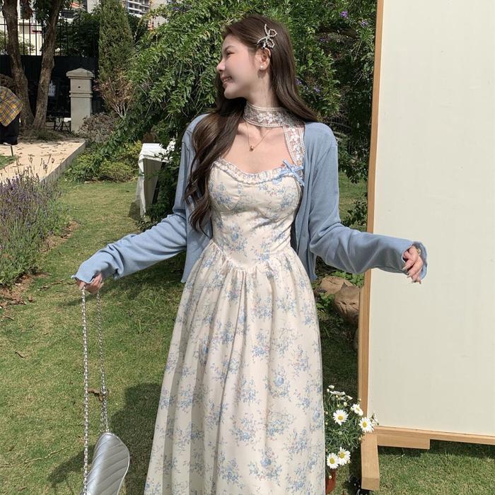 FIRST GIRL - SETELAN DUA POTONG GAUN SUSPENDER MANIS ROK PANJANG MOTIF BUNGA UKURAN BESAR, CARDIGAN + DRESS WANITA MUSIM