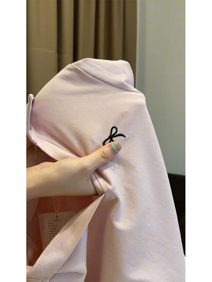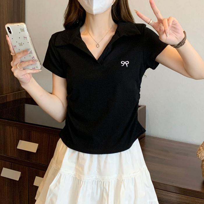 KAOS DENGAN SULAMAN DASI KUPU-KUPU KERAH POLO MERAH MUDA/ATASAN LENGAN PENDEK V NECK WANITA TERBARU BAJU PANJANG - MERAH