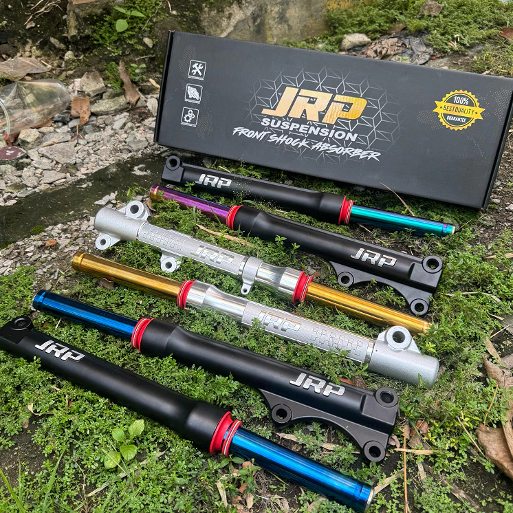 SHOCK DEPAN + TABUNG JRP UNTUK MIO SMILE/ MIO SPORTY / BEAT / VARIO / SCOOPY / SHOCK AS RAINBOW kuningan mengkilap BLUE / PIPE DEPAN HITAM SILVER