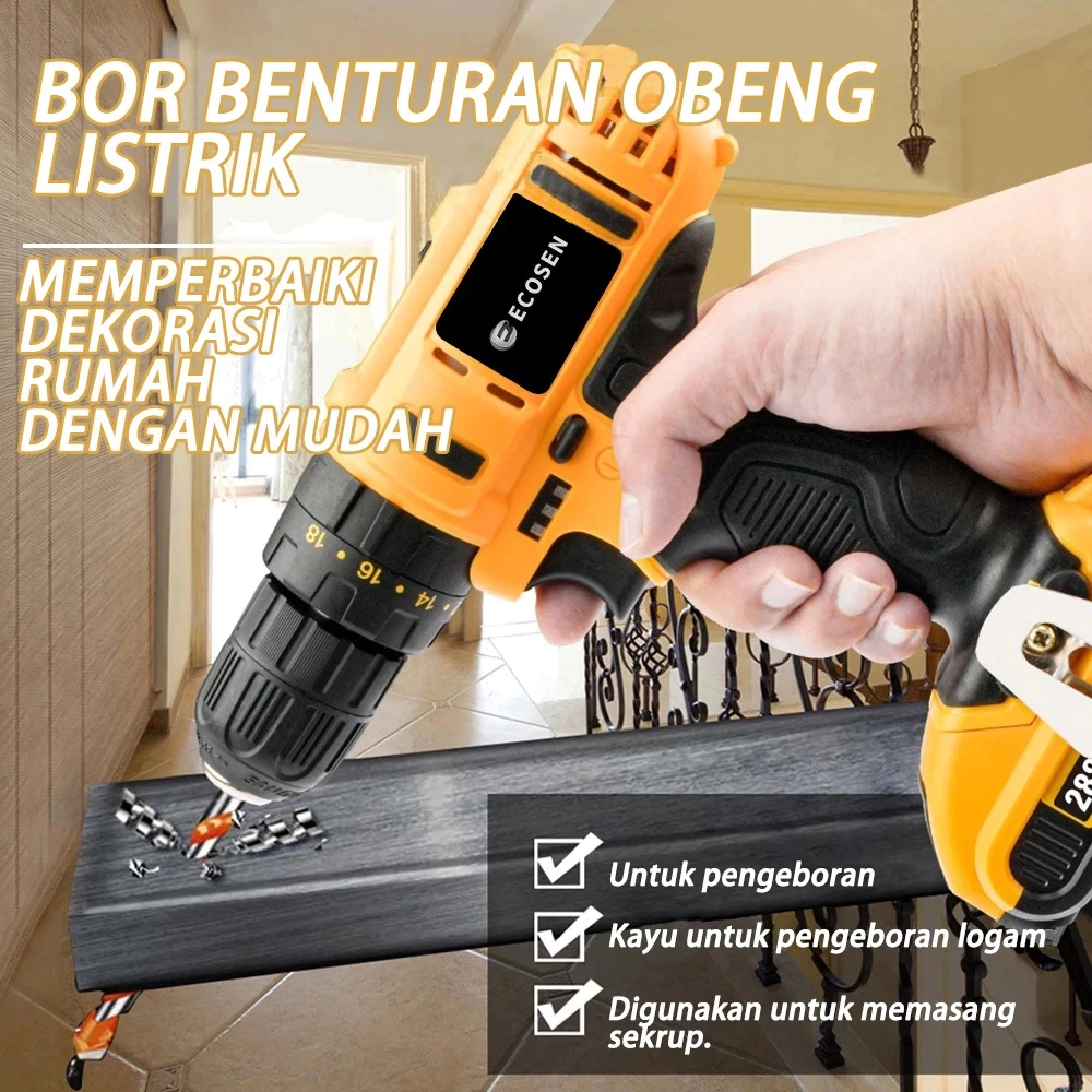 Ecosen Mesin Bor Baterai Bor Listrik Set Lengkap Bor Impact Baterai Tangan Cordless Drill Battery Bor Cordless Power Dri