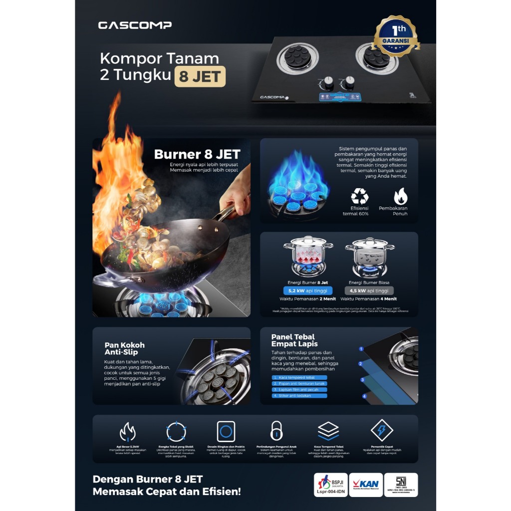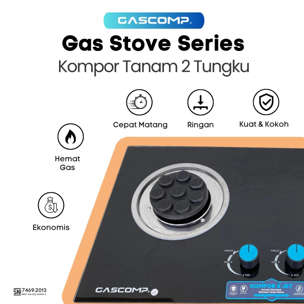 Gascomp Kompor Tanam Kaca 8 Jet Kompor Gas 2 Tungku 8 Jet Spesial Kompor Tanam Burner Lebih Hemat Gas Kompor Gascomp Kom