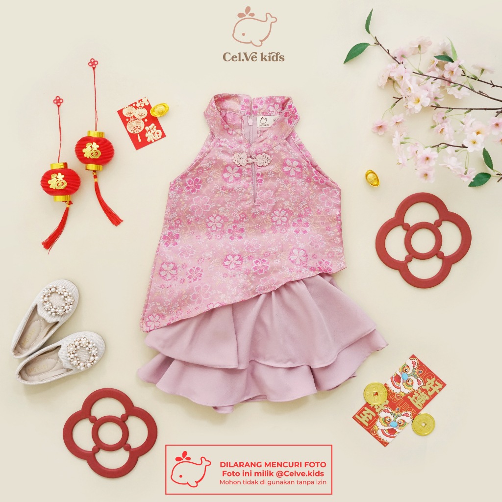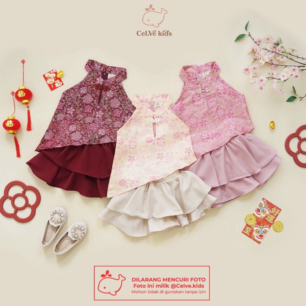 Celvekids - Stelan Imlek Huo Mei Set Baju Rok Celana Anak Perempuan Korean Style Bahan Semiwool + Ceongsam Usia 1-8Th