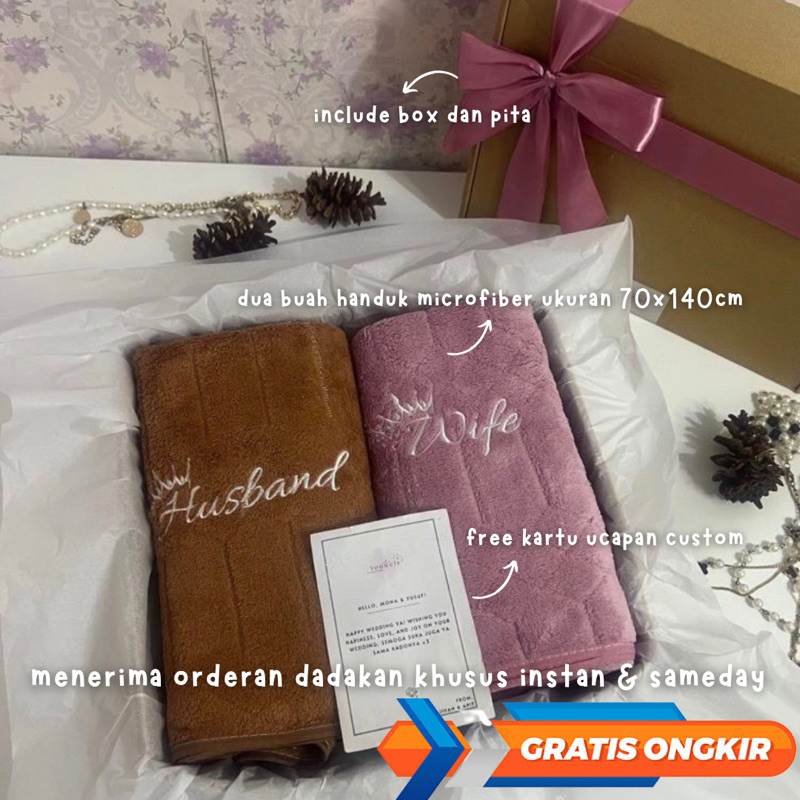 Hampers Handuk Bordir Husband Wife 70X140Cm Couple / Hampers Handuk Couple Wedding Pernikahan / Hampers Kado Souvenir /