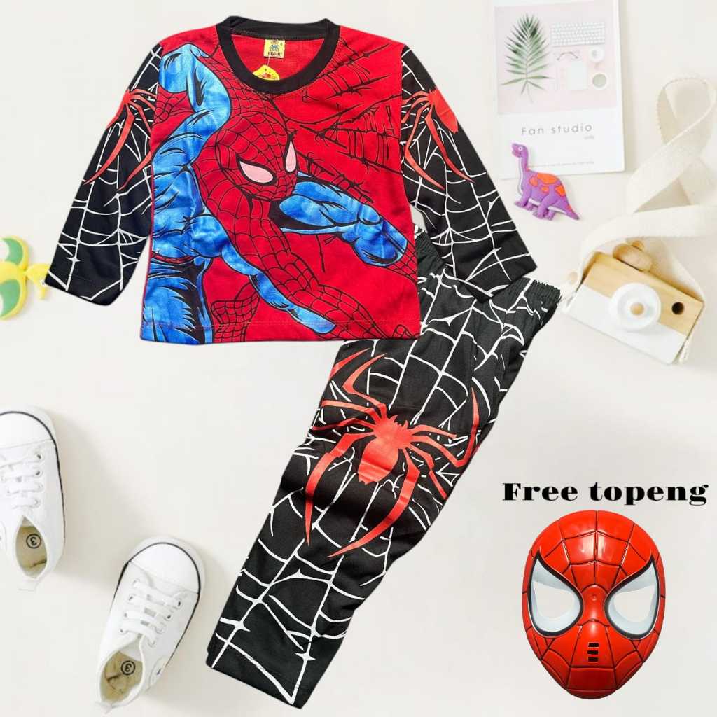 Baju Stelan Anak Laki-Laki Lengan Panjang Motif Spiderman Bahan Katun Usia 1-10 Tahun Free Topeng