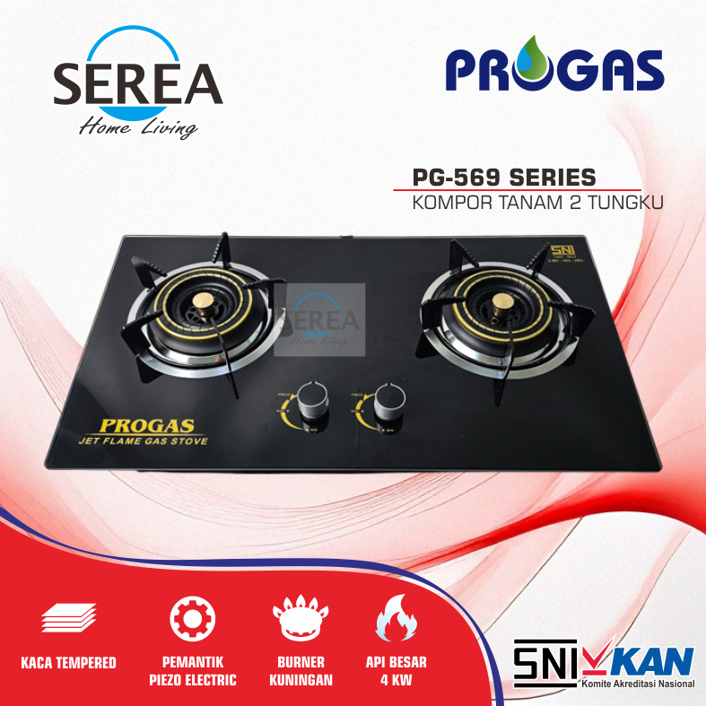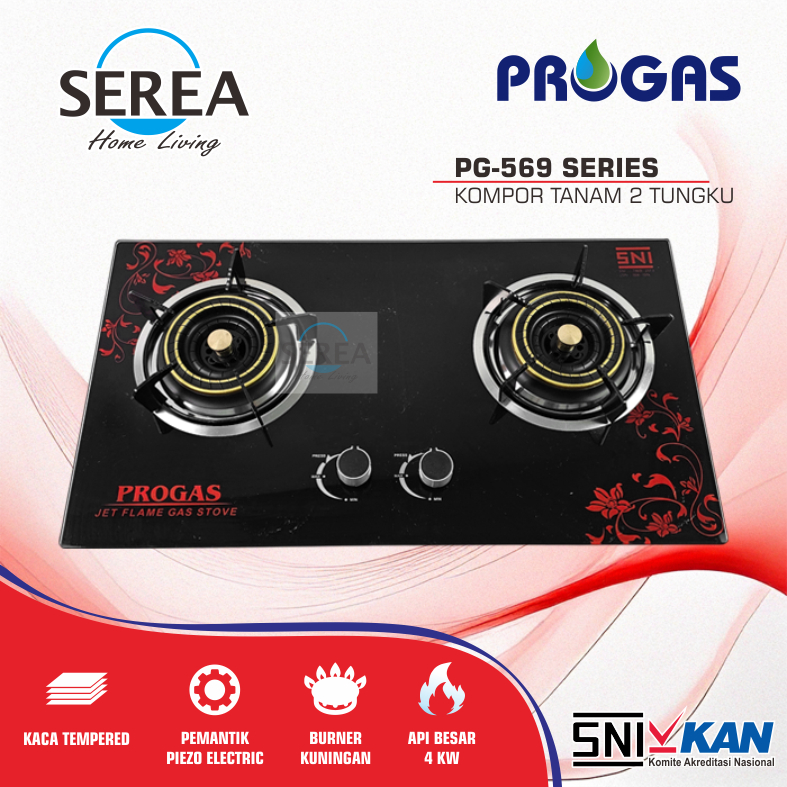 Progas Kompor Gas Tanam 2 Tungku Pg-569 Kaca Hitam, Bunga Merah Sni Garansi 1 Tahun Api Biru Besar