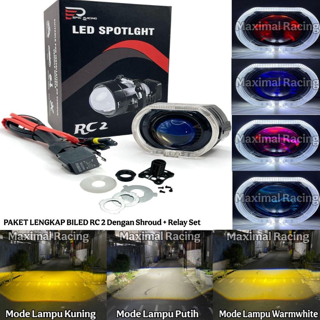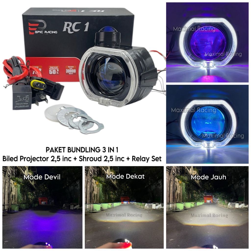 Bundling Paket Biled Epic Racing Rc 1 Lengkap Dengan Shroud Dan Kabel Relay Tinggal Pasang Blue-Lens High Power Dc12V/50