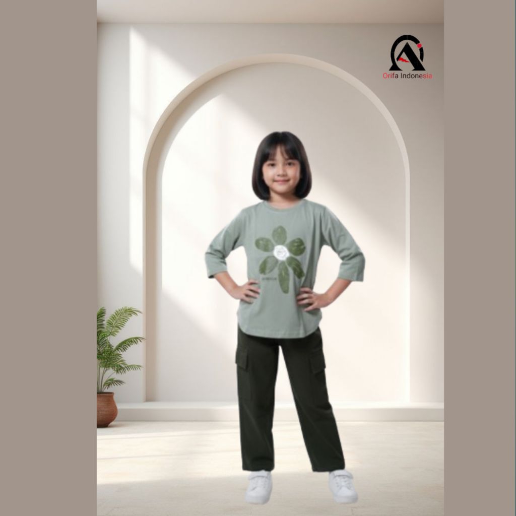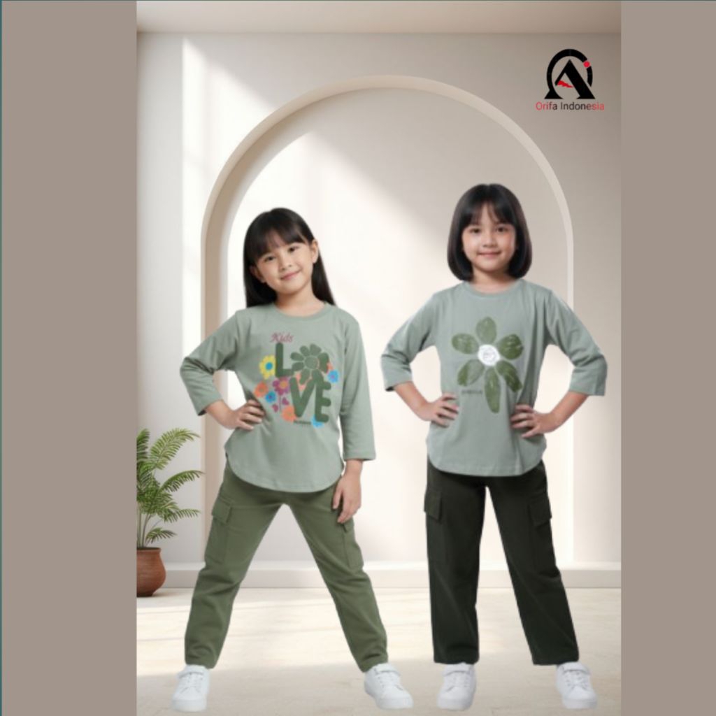 Orifa Indonesia Setelan Anak Kombinasi Warna Bahan Catton24S Lengan 7/8 Model Kaos Belah Oval Celana Cargo