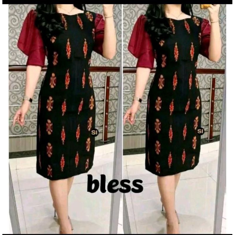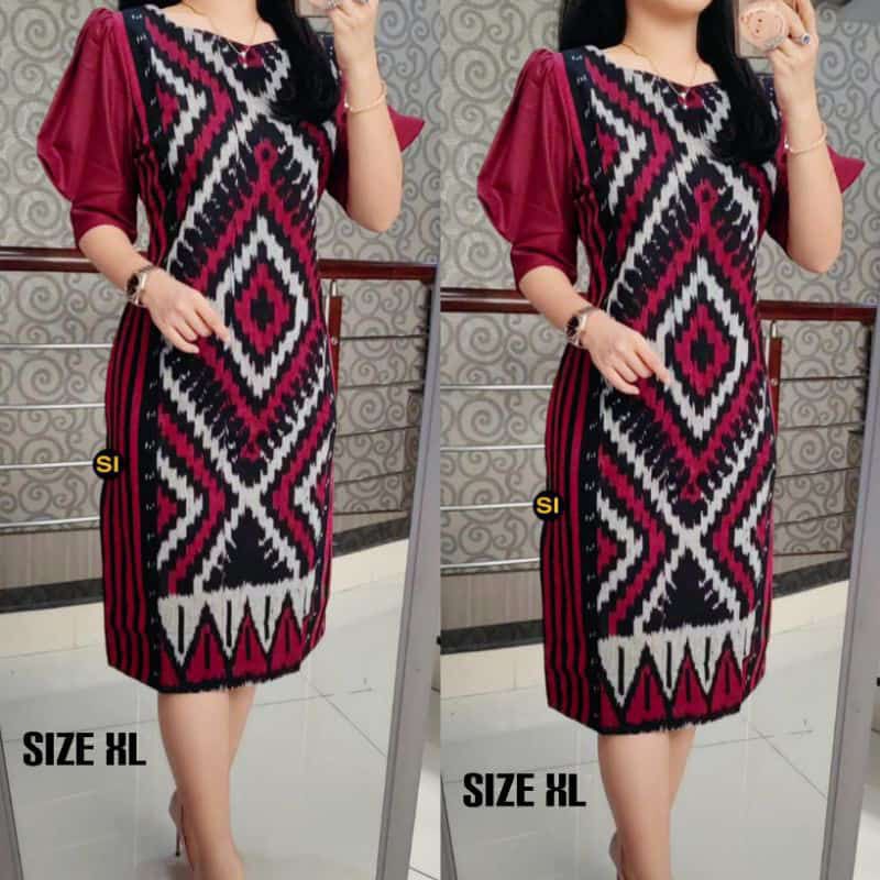 Dress Tenun Lengan Balon Kombinasi Toyobo Dress Pesta Terbaru