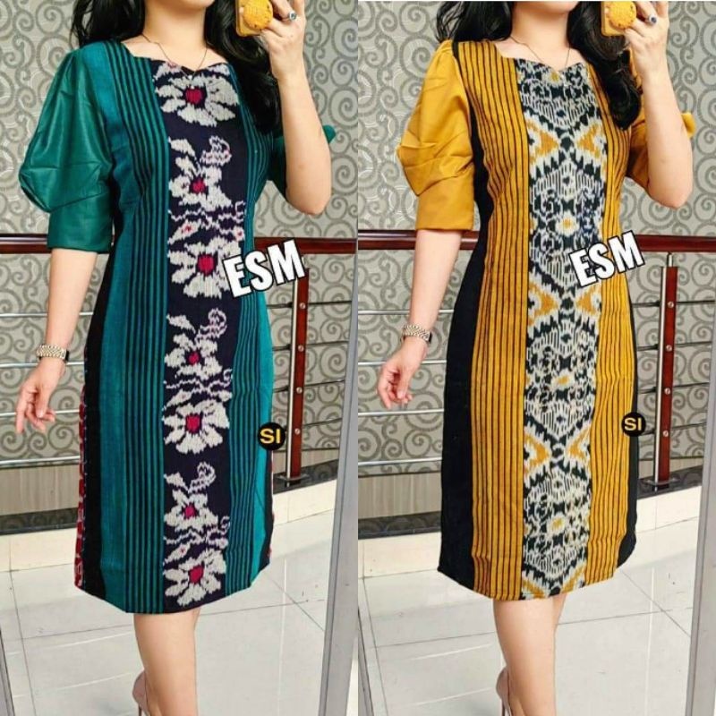 Dress Tenun Baju Slim Kombinasi Toyobo Lengan Balon