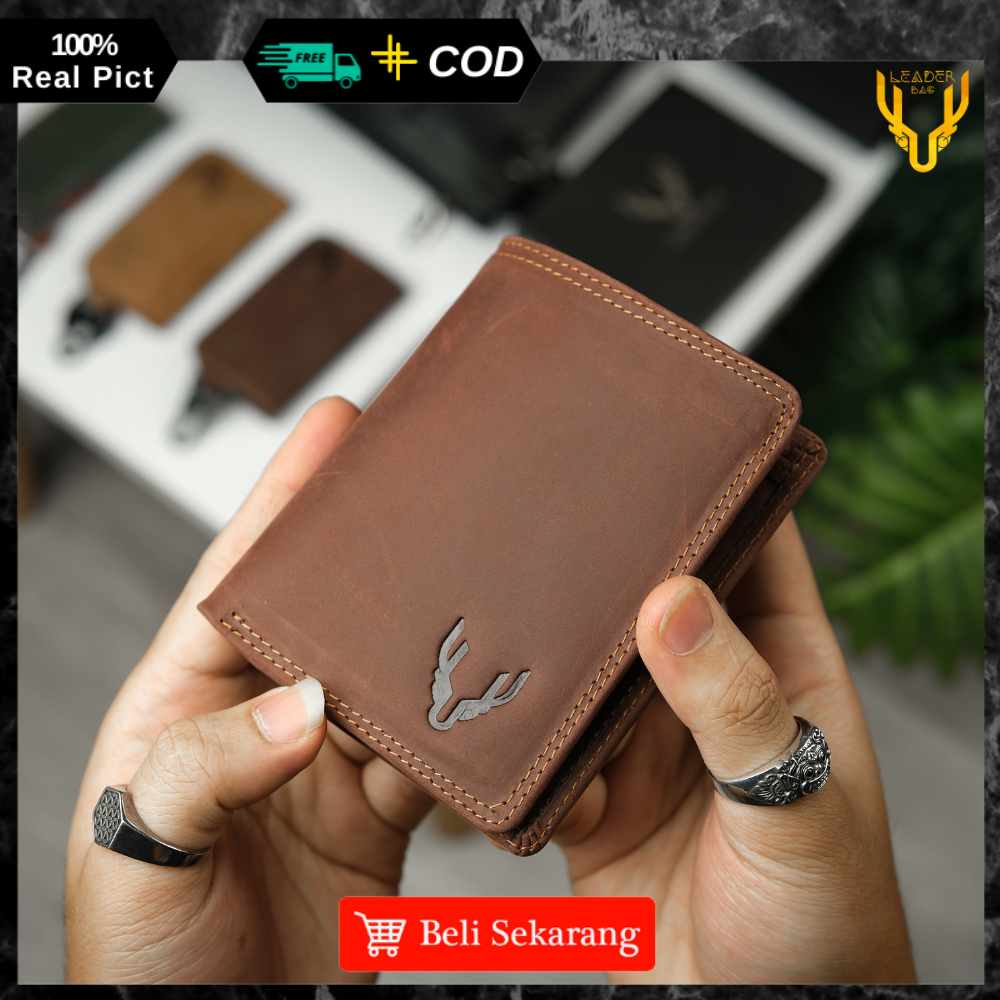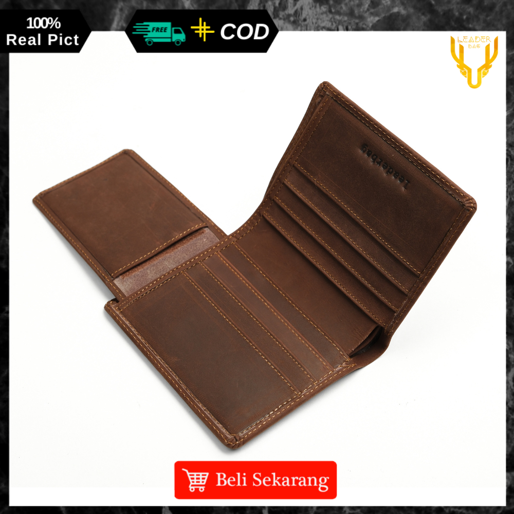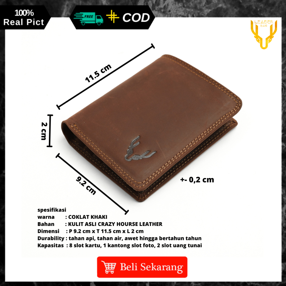 Leaderbag Dompet 3/4 Pria Kulit S4ppi Asli Warna Coklat Khaki Premium Terbaru Wallet Kartu Lipat Branded Elegan Crazy Hourse Leather