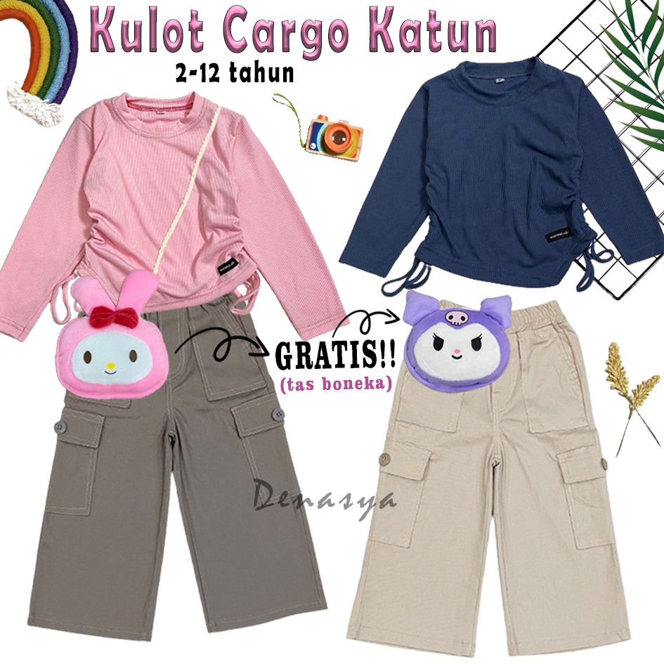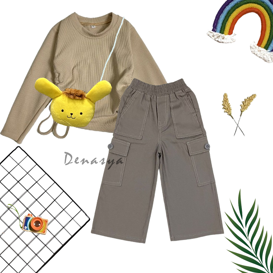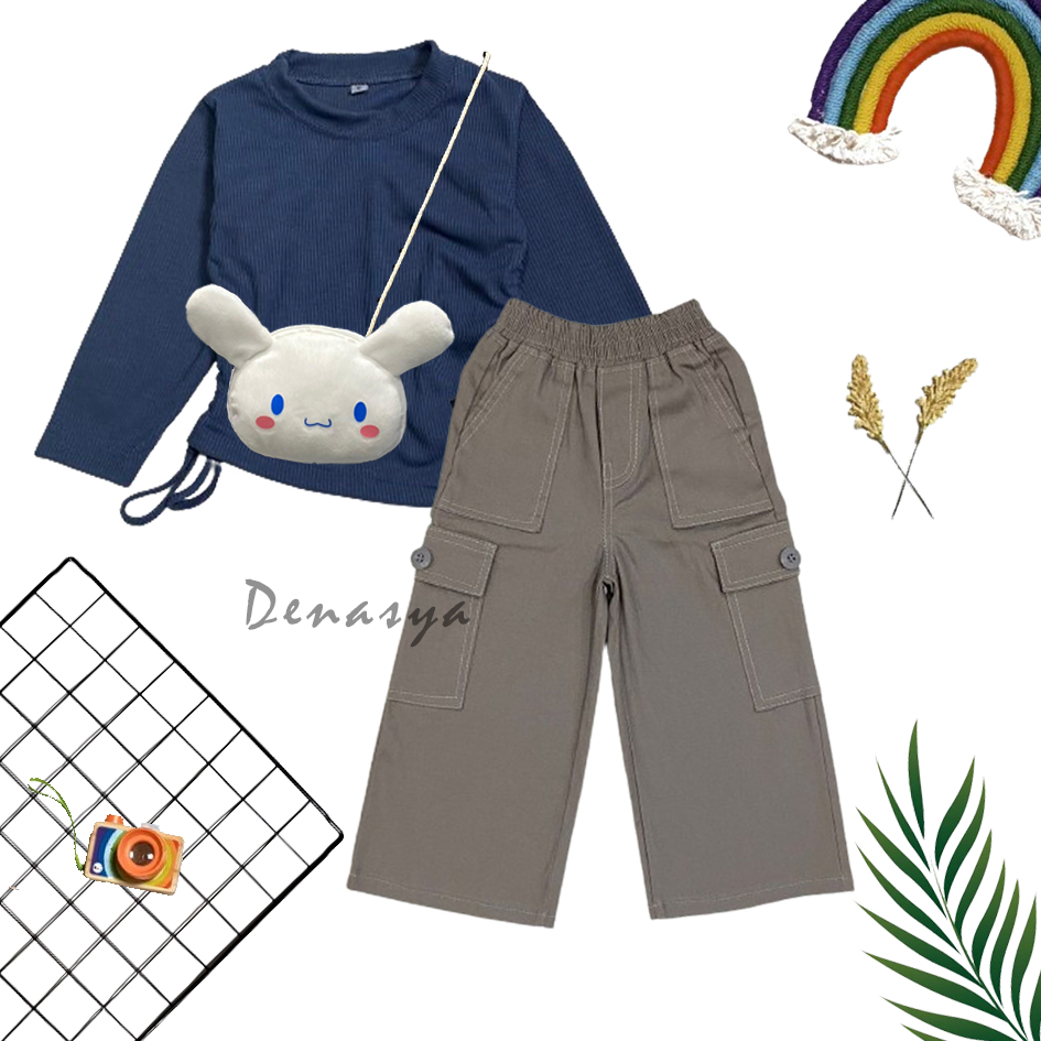 Setelan Anak Perempuan Gratis Boneka / Baju Anak Kaos Crop Serut Rib Knit / Celana Kulot Cargo Anak Cewek