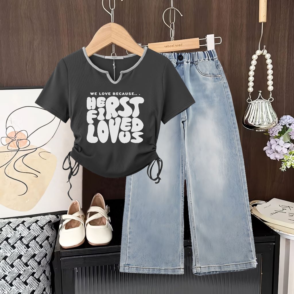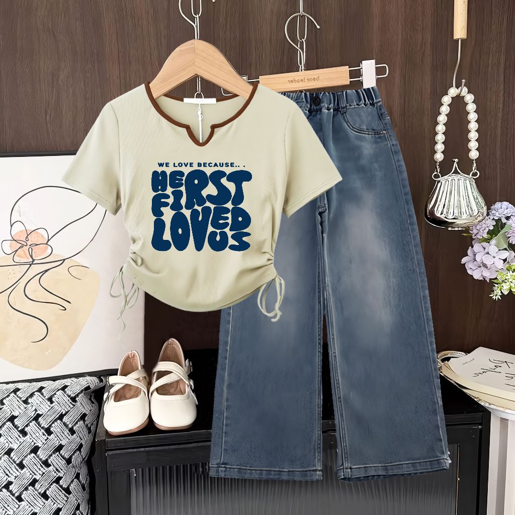 Setelan Anak Perempuan Kaos Katun Lengan Pendek Dan Celana Jeans Kulot Ukuran S-3Xl Untuk Usia 1-12 Tahun. Set Baju Main