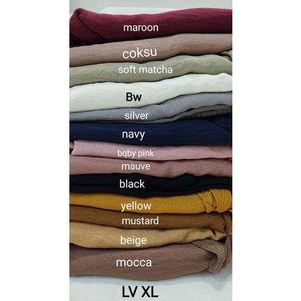 BLACK, NAVY, BROKEN WHITE, Warna lain, Abu, Maroon, Plump, Late, Coklat pramuka, Coksu, Dusty pink muda, Matcha, Mocca, Cream, Hijau Mint, Olive, Milo, Sage, Ungu, Baby blue, Army, Wheat cream, Mauve, Kopiko, Teracota, coal, Fusia, Sand