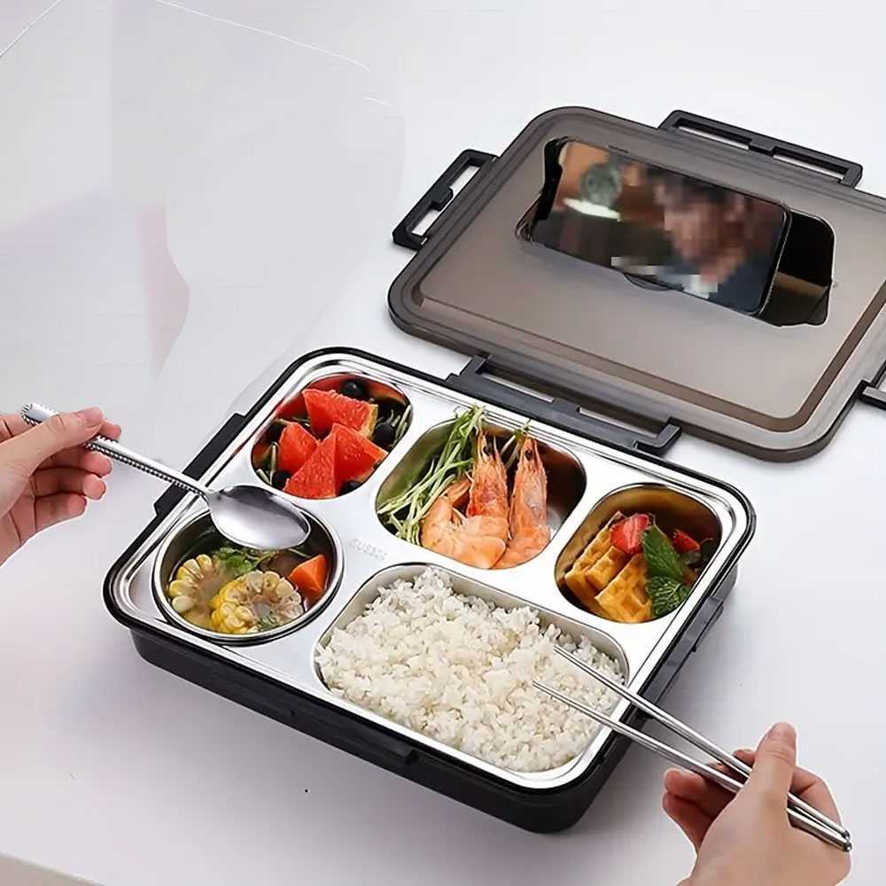 Kotak Makan Bekal Anti Tumpah dengan Mangkuk Sup Stainless Steel Lunch Box 5 Grid Sekat