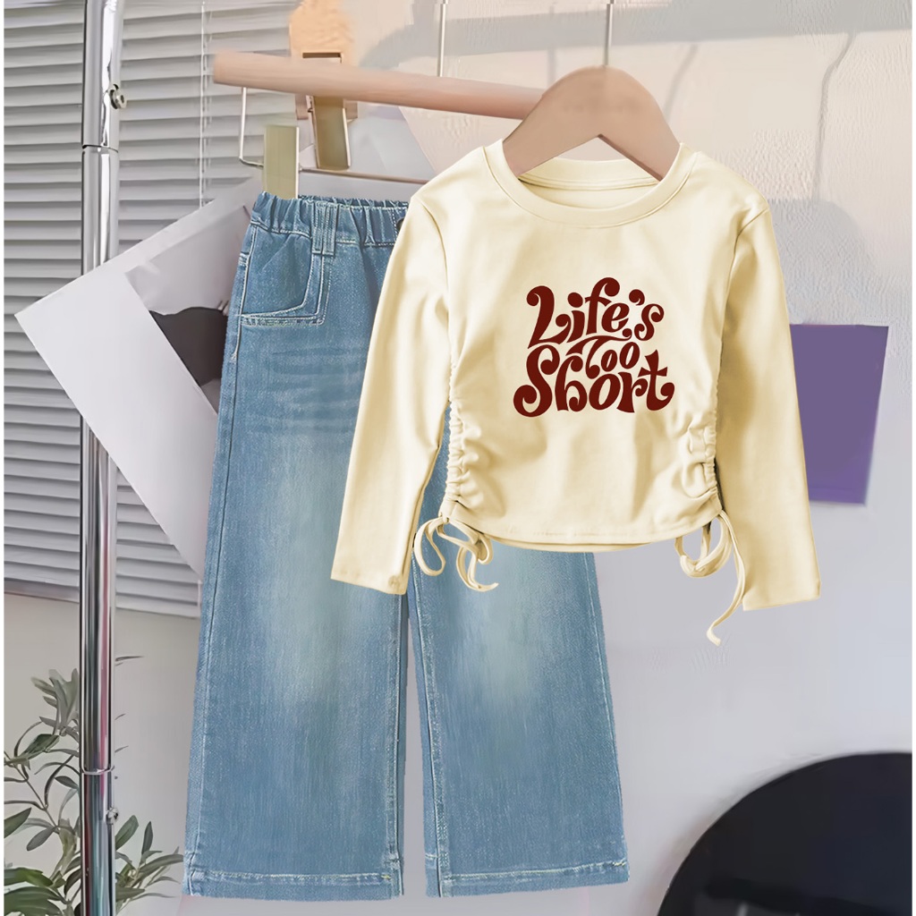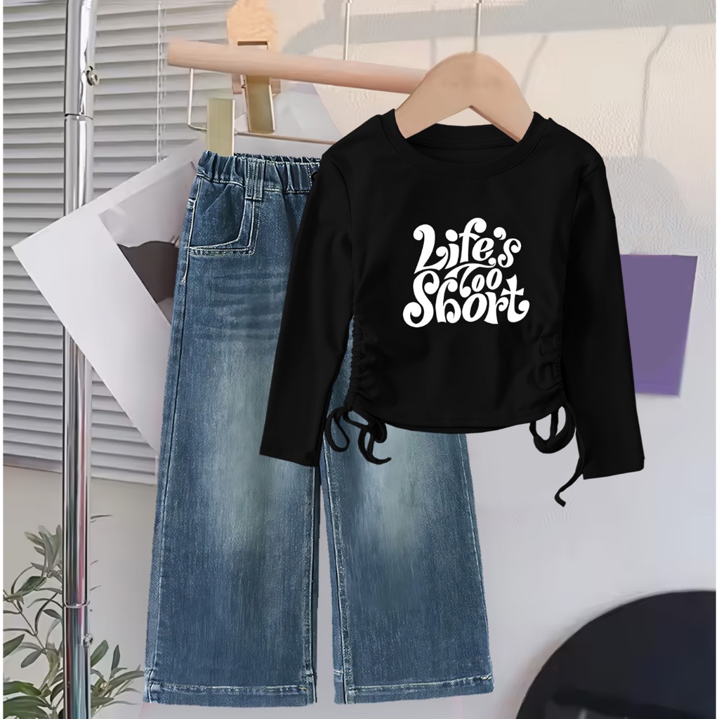 Setelan Baju Crop Panjang Celana Jeans Anak Cewek Usia 1 2 3 4 5 6 7 8 9 10 11 12 Tahun