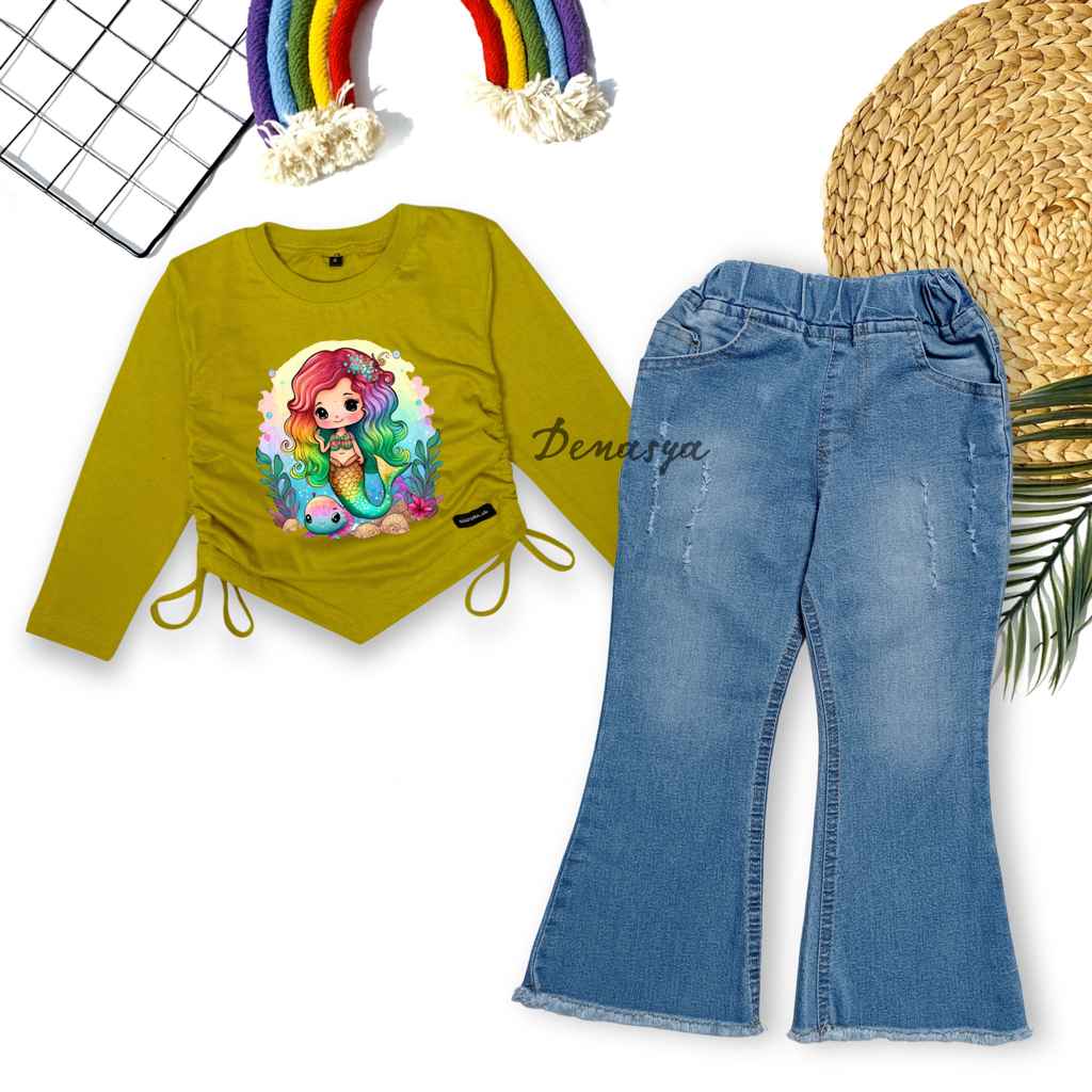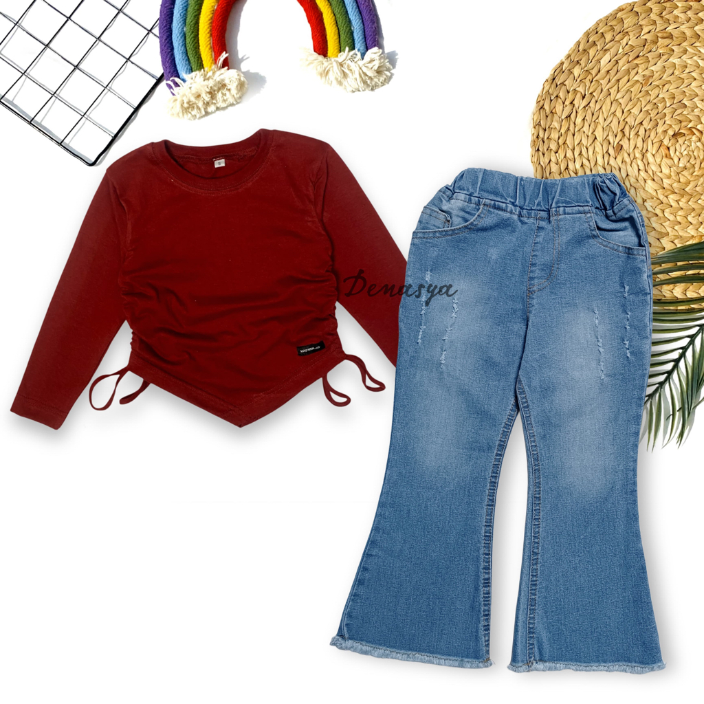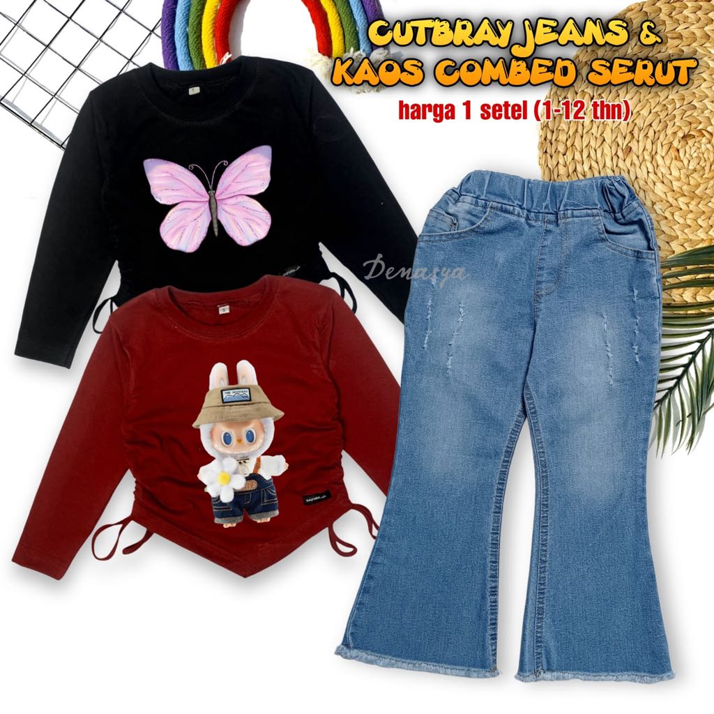 Setelan Cutbray Jeans Kekinian / Celana Cutbray Anak Perempuan / Kaos Combed Serut Motif Sablon 1-12 Tahun