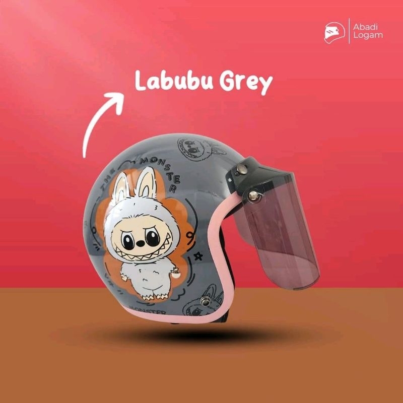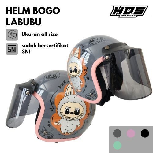 HELM Bogo Dewasa Half Face Labubu Grey SNI HDS Helmet Retro Stylish Cowok Cewek Hijab
