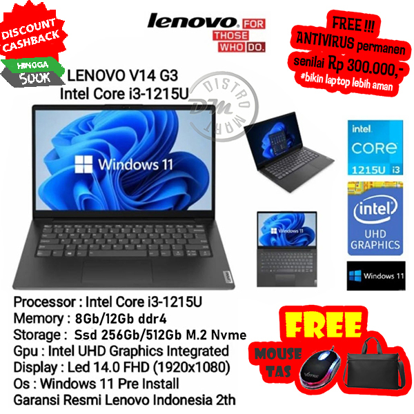 LAPTOP LENOVO V14 G3 CORE i3-1215U (gen12 paling terbaru) 8GB SSD 256/512GB 14" FHD GARANSI RESMI