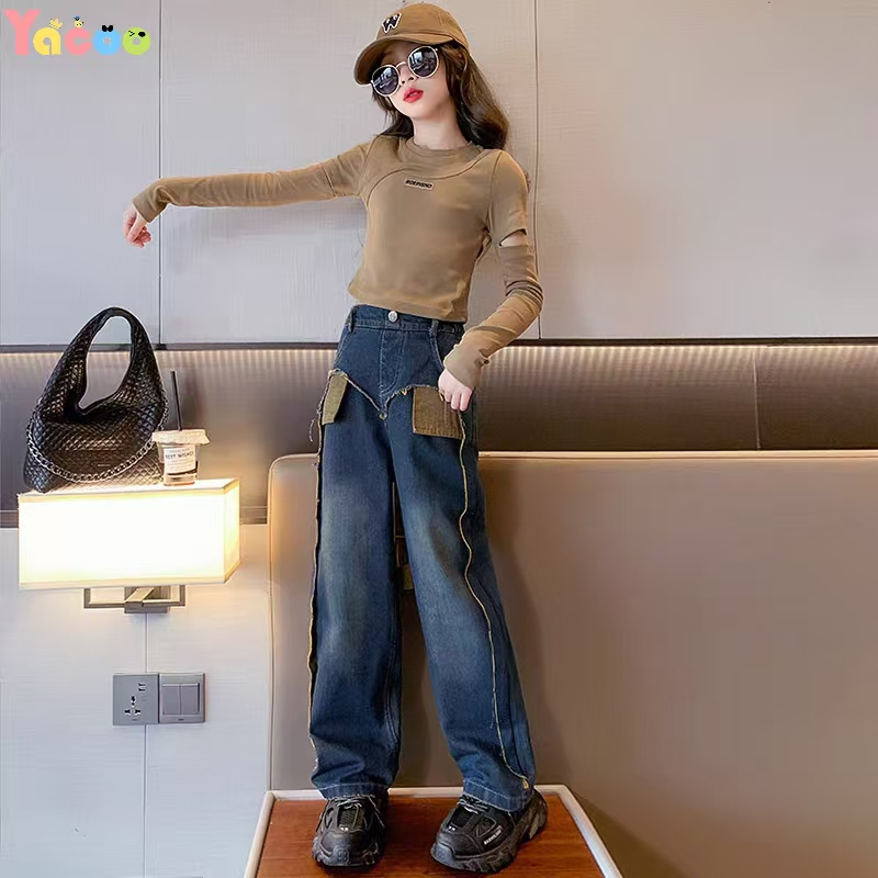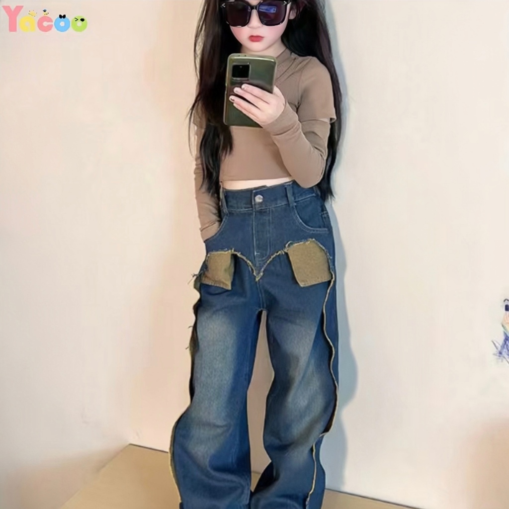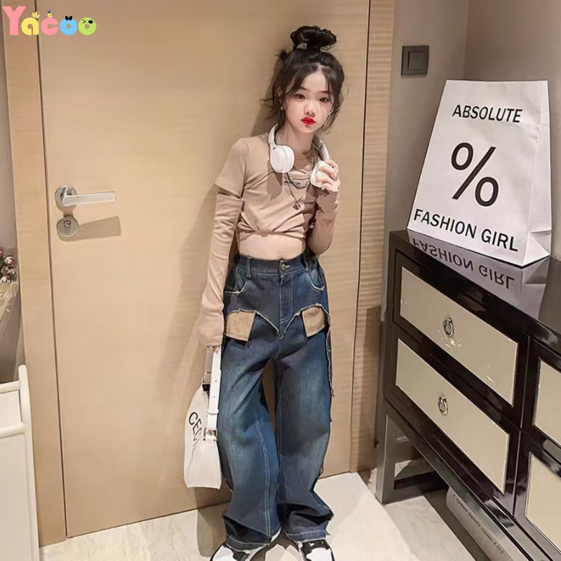 Yacoo Setelan Anak Perempuan 2-12 Tahun Korea Style - Kaos Katun Bahu Terbuka Lengan Panjang Celana Jeans Baggy Hati