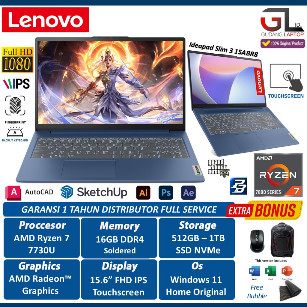 Lenovo Ideapad Slim 3 15 Ryzen 7 7730U 16GB 2TB SSD 15.6 FHD IPS Touchscreen Windows 11 Home