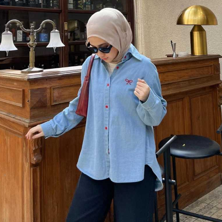 ( NEW 2026 } ATASAN WANITA KEKINIAN Be.gracious Kemeja jeans pita ribbon terbaru ATASAN WANITA KEKNIAN JUMBO