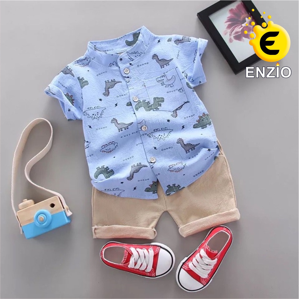 SALE 1.1 Enzio Kids Setelan Kemeja Anak KERAH SHANGHAI DINO Lucu 1-4 Tahun