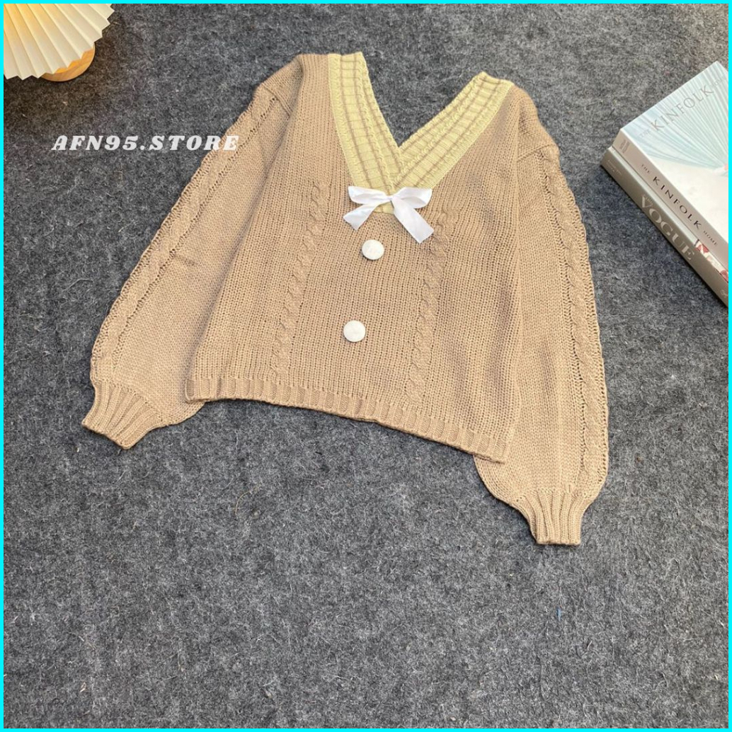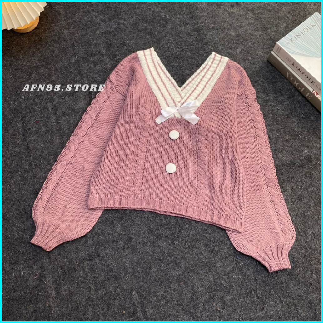 Afn95 - Blouse Wanita Lengan Panjang Sweater Cewek Rajut Knit Vintage Pita Kerah V Tebal