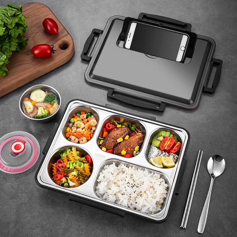 Kotak Makan Bekal Anti Tumpah dengan Mangkuk Sup Stainless Steel Lunch Box 5 Grid Sekat