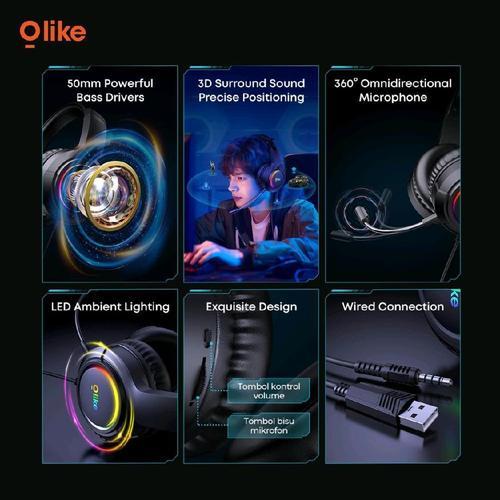 Olike GH2 Wired Gaming Headphone Headset Game Kabel 2M Mic Omnidirection RGB Light 3D Sound Bass Max