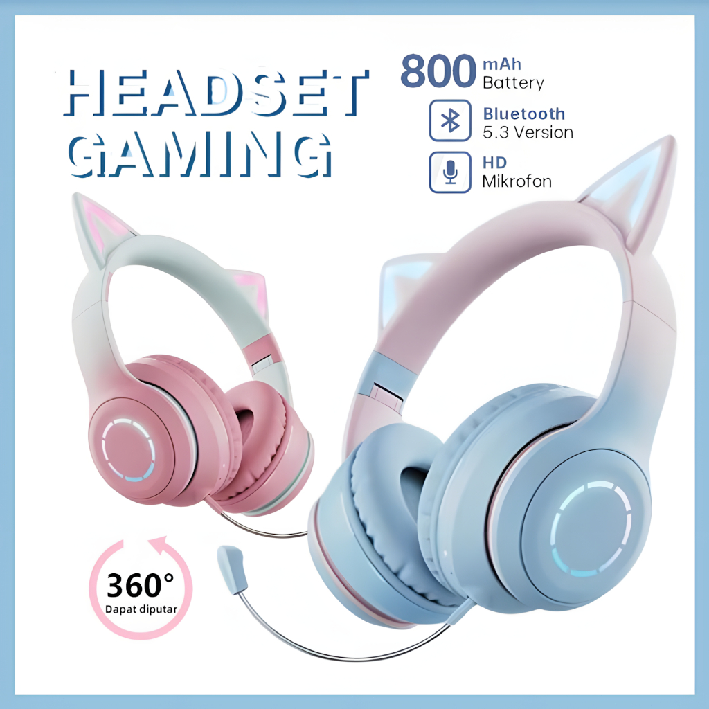 【】Headset Gaming Bluetooth 5.3 RGB Light With Cat Ears Gaming Headphone With Noise Canceling Mic Hadiah Anak Perempua
