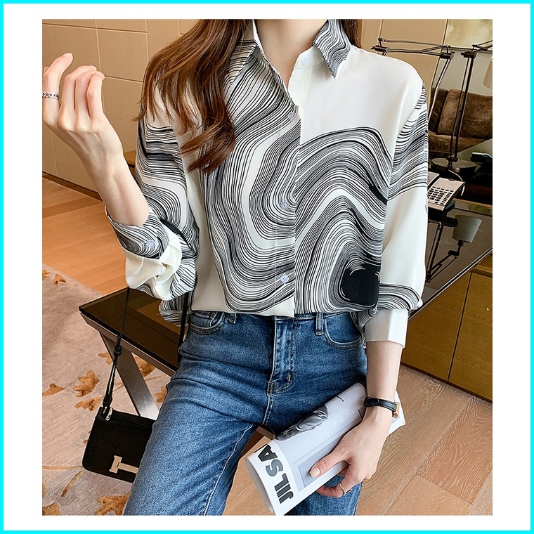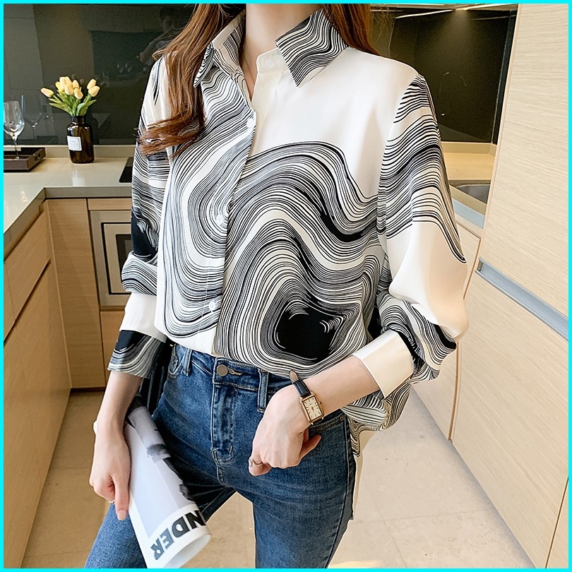 Kualitas Tinggi Cetak Garis Geometris Hitam Dan Putih Kemeja Wanita Lengan Panjang Model Street Fashion Atasan Kerja Pes