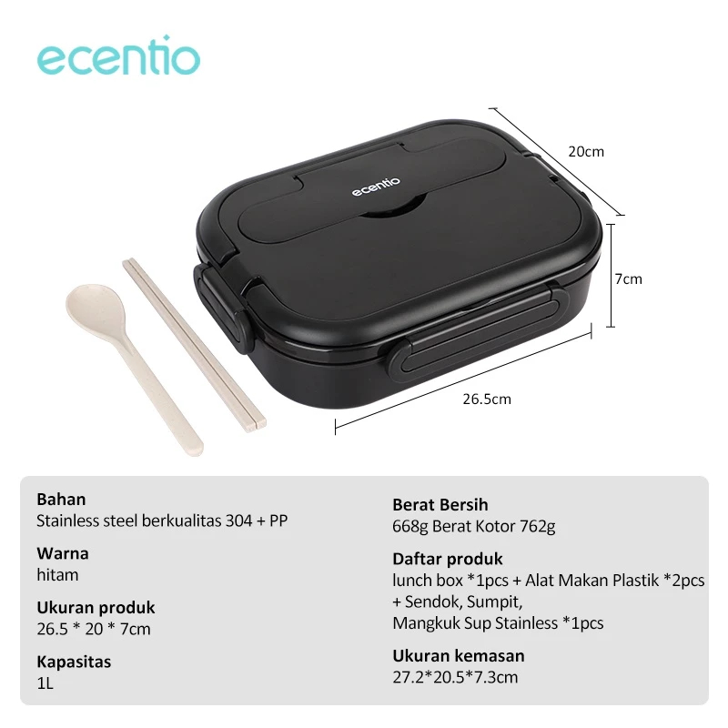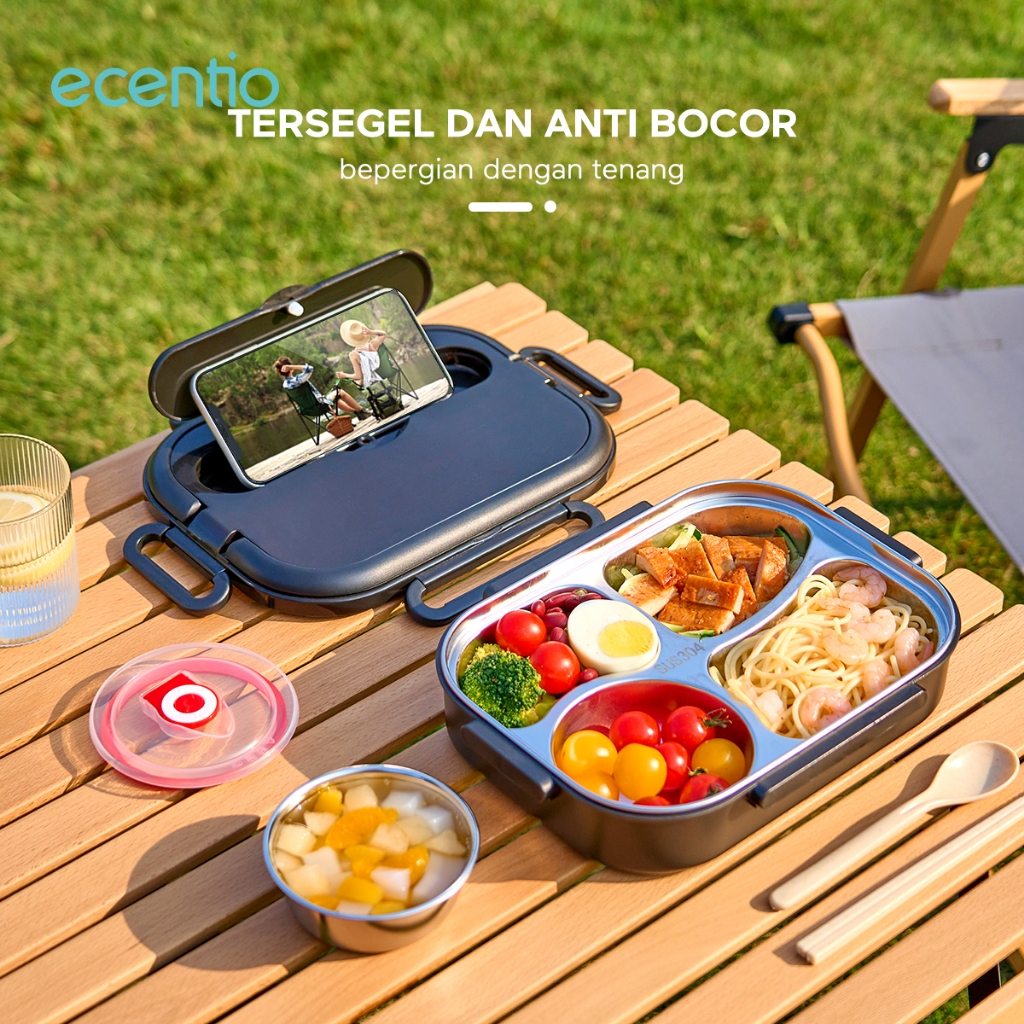VATIRI x ECENTIO Lunch Box 1000ml Stainless Steel 4 Sekat Anti Tumpah Free Sendok Sumpit Anti Bocor