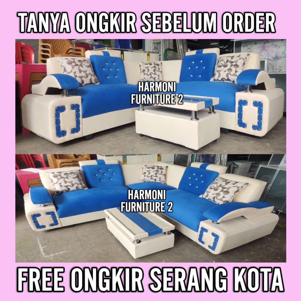 Sofa Sudut Minimalis + Bantal + Meja Kaca Transparan