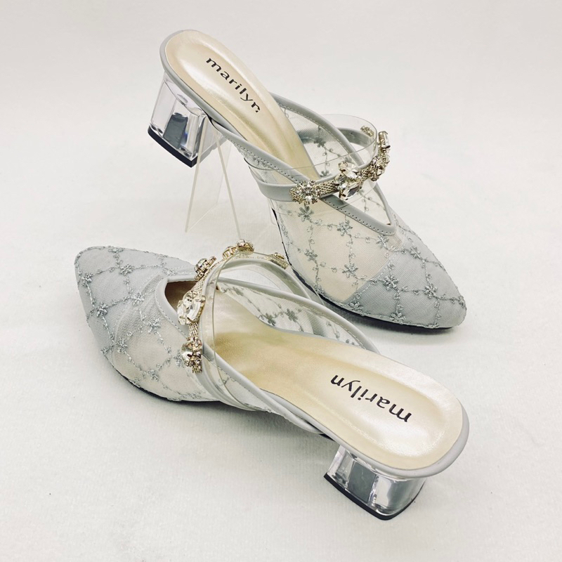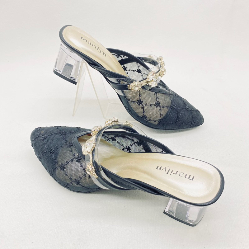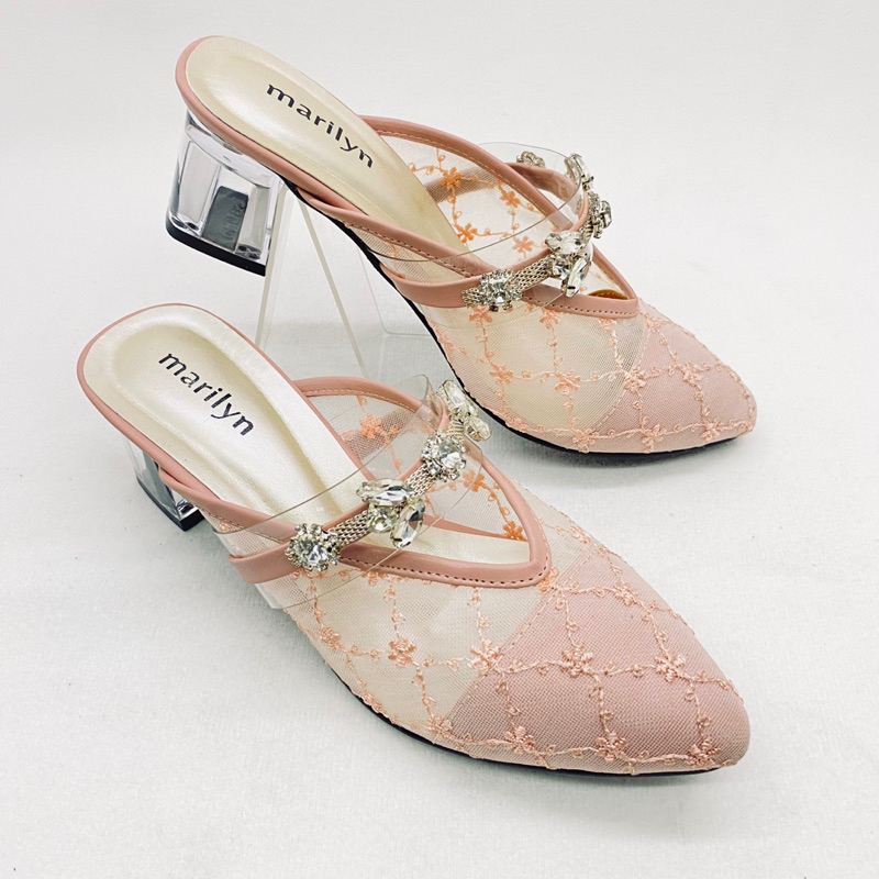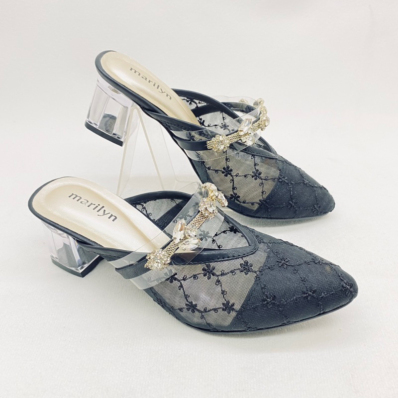 Marilyn - Sandal Pesta Wanita Sandal Mules | Sandal Wisuda Wanita Brukat | Hak Kaca 5cm