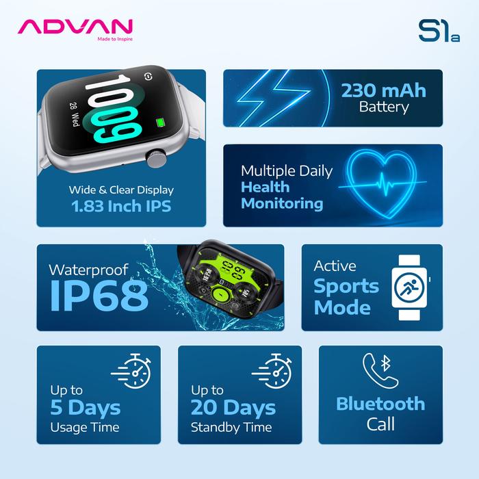 ADVAN SMARTWATCH S1A IPS DISPLAY 1.83" TOUCHSCREEN WATERPROOF IP68 BLUETOOTH CALL HEALTH MONITORING JAM TANGAN PINTAR SM