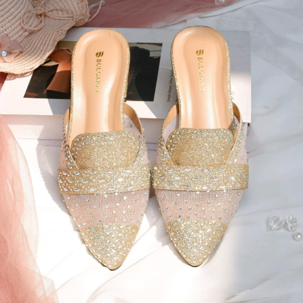 Heels Pesta Gliter Mewah Terbaru Tinggi 5cm ZN16 Square Toe Shoes Karet Wanita