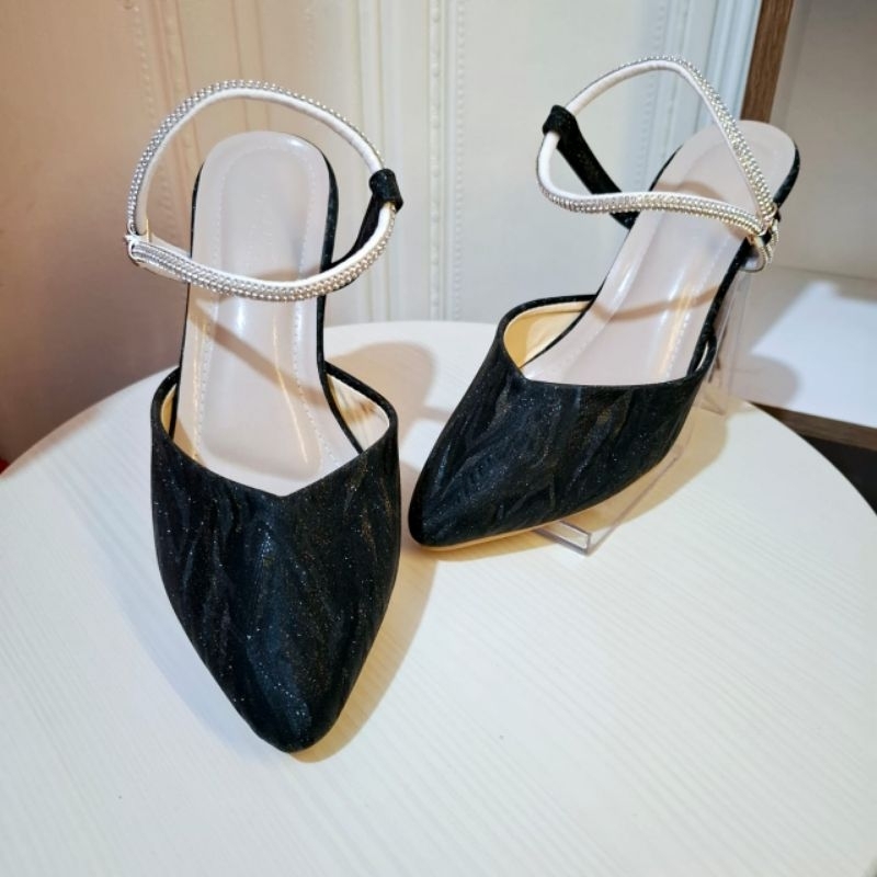 DCollection BH 02 Sepatu Pesta Tali Permata Transparan Sandal Heels Wanita Hak Kaca 5 Cm